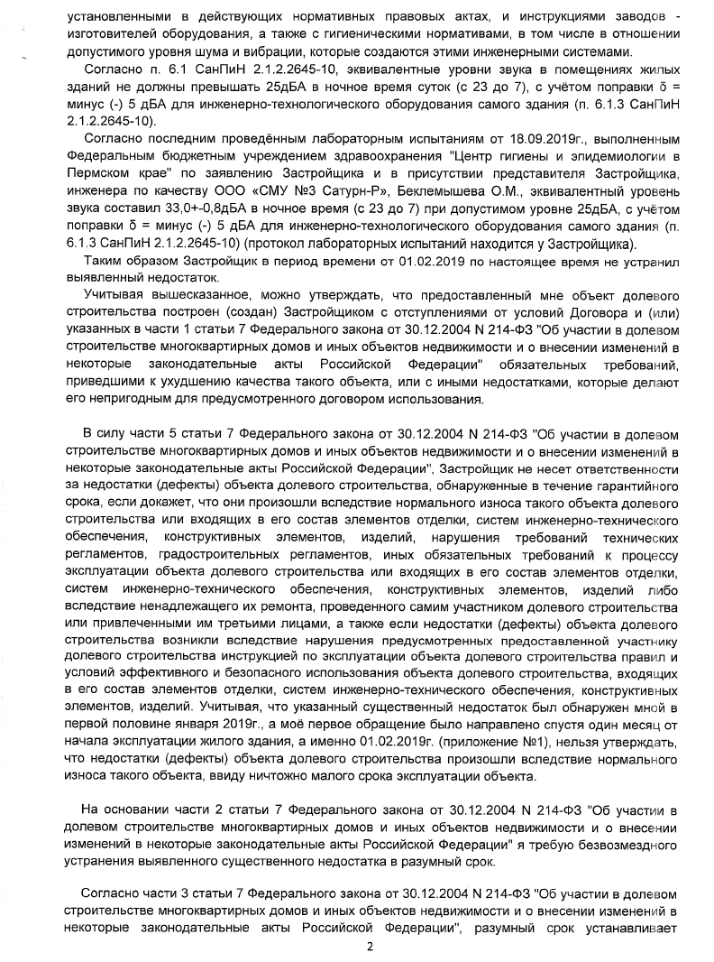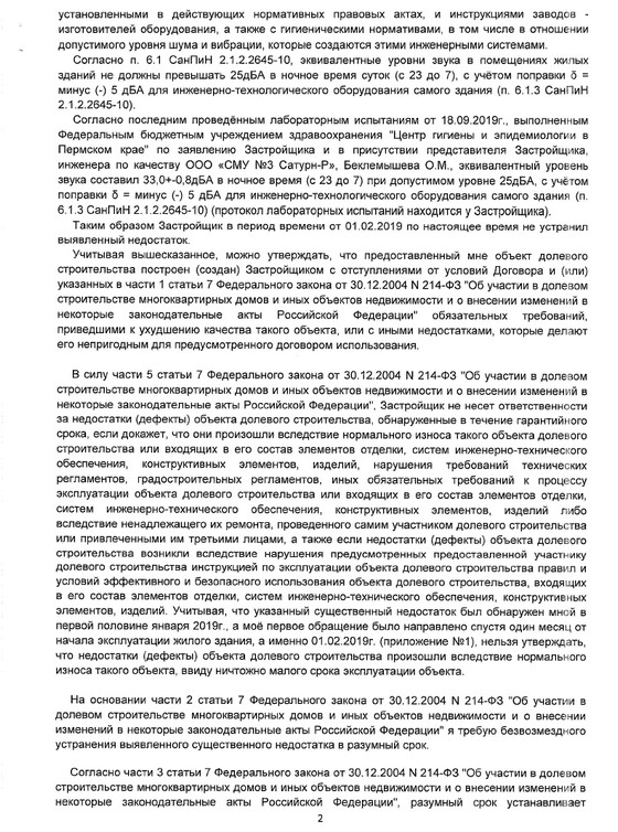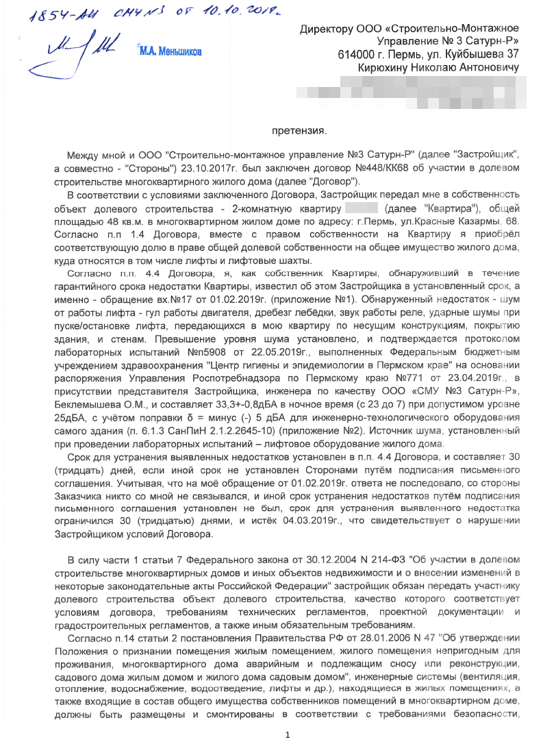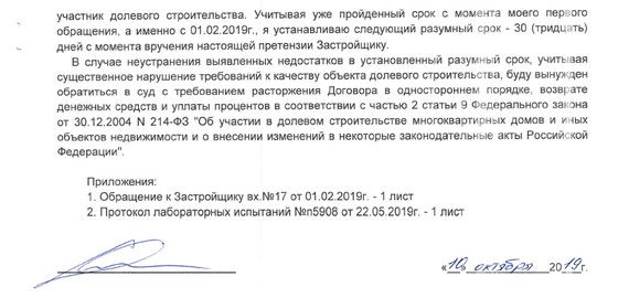Поняв, что путь через Роспотребнадзор - тупиковый, я решил судиться с застройщиком, предварительно дав ему ещё один шанс, вручив 10 октября 2019г. досудебную претензию: