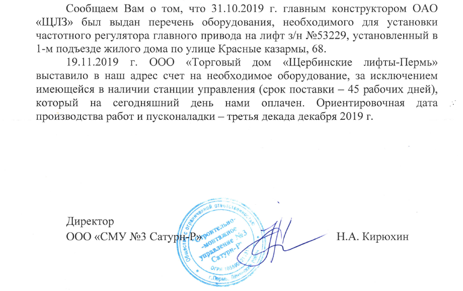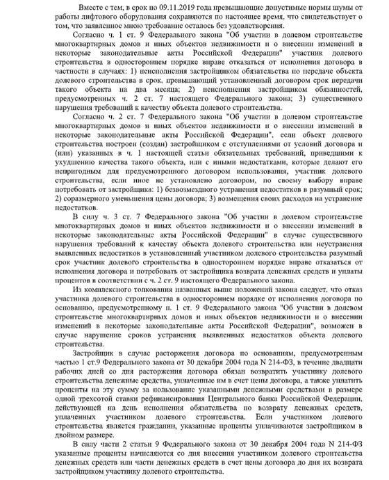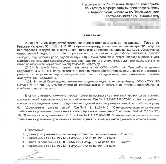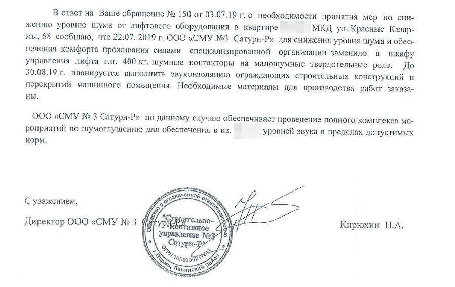 Согласно этому письму, Сатурн-застройщик обещает принять меры по снижению уровня шума в моей квартире, и даже уже 22 июля 2019г. заменил контакторы на молошумные реле. Таким образом, при моём обращении к застройщику 1 февраля, он начал принимать меры только 22 июля, т.е. полгода никто ничего не предпринимал. После очередных принятий мер в августе месяце, в виде шумоизоляции стен машинного помещения, застройщик заказал очередные измерения уровня шума в "Центре гигиены и эпидемиологии в Пермском крае", которые состоялись 19 сентября 2019г., и не показали никаких изменений - всё те же 33дБА. Протокола измерений у меня нет, т.к. заказчиком измерений был не я, а передача копии протокола Сатурном не в его интересах.