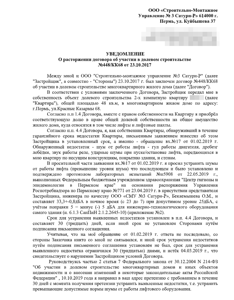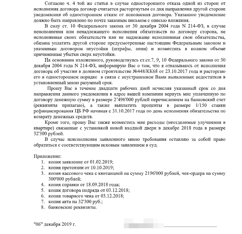 Так и не дождавшись каких-либо действий от застройщика, в конце ноября я обратился к юристу, который составил уведомление о расторжении договора в одностороннем порядке, отправив его застройщику 6 декабря 2019г. заказным письмом.