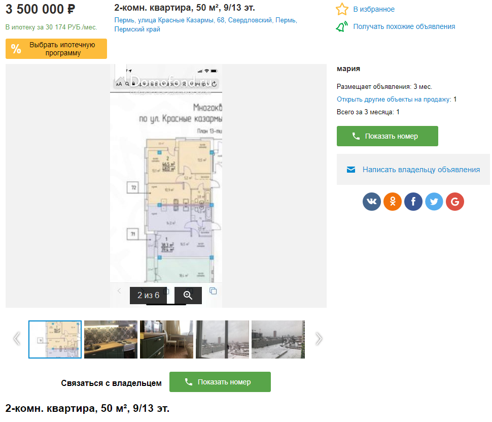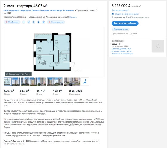 Вот и наступил новый, 2020 год. После праздников, 14 января 2020г., меня пригласили на встречу с Долгушиной О.В. С улыбкой на лице она сказала, что не хотела бы доводить дело до суда, и с щедростью предлагает мне расторжение договора по соглашению сторон с выплатой половины неустойки. То есть, если расчитать размер неустойки с 1 ноября 2017г., получается, что я могу претендовать на 900 с лишним тысяч, что в сумме с возвращенными деньгами за квартиру как раз равно текущей стоимости аналогичной квартиры. Пощёлкав на калькуляторе, с учётом затрат на установку двери, ламинат, моральные переживания, она предложила 600 тысяч, мотивировав тем, что на протяжении года я жил в этой квартире, она самотризировала, а ещё есть 333 статья ГК РФ, на основании которой они будут требовать снижение неустойки, если дело дойдёт до суда. Странное предложение. Если ты не хочешь доводить до суда, сделай нормальное предложение. И вообще, ставить мне в вину факт моего проживания в моей же квартире, это абсурд. Так вот, на текущий момент, если рассматривать аналогичную квартиру в моём же доме, т.е. с такой же амортизацией, то вот какое объявление я нашёл: