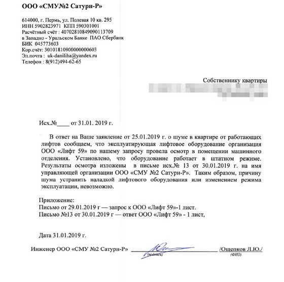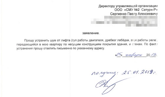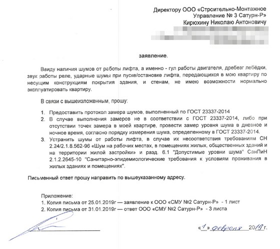 На тот момент мне сложно было судить, является ли данный шум существенным, или это нормально, но субъективно шум был громким, ярко выраженным. Первое время лифт меня не беспокоил, т.к. жильцов в моём подъезде было мало, лифтом пользовались редко, и ночи были тихими. Со временем всё изменилось - лифт ездил не останавливаясь. Ночами лифтом тоже начали активно пользоваться - в будни до 2-3 ночи, а в выходные на протяжении всей ночи можно было слышать его гул. Поняв, что надо что-то делать, 25 января 2019г. я обратился в УК с просьбой устранить этот шум: