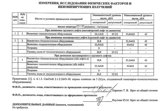 Роспотребнадзор в течение двух недель организовал замеры уровня шума в жилой комнате, расположенной ближе к шахте лифта, первые замеры были выполнены для установления факта нарушения уровня шума, что, собственно, подтвердилось. Следующие замеры были выполнены 22 мая 2019г. в присутствии представителя застройщика, инженера по качеству ООО "СМУ №3 Сатурн-Р", Беклемышева О.М. Тут же выкладываю результаты следующих замеров, выполненных 11 июня 2019г. в присутствии представителя УК, главного инженера ООО "СМУ № 2 Сатурн-Р", Коняшкина С.А.: